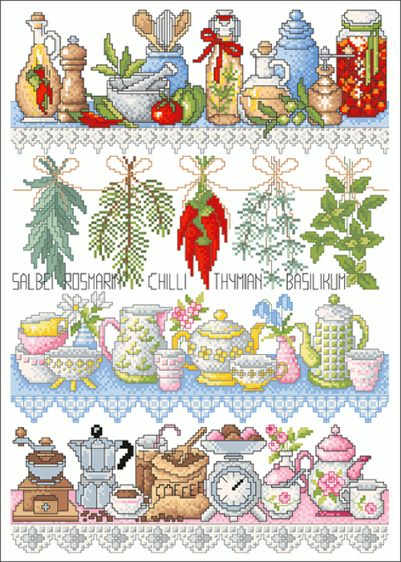 Alle mediterranen Kräuter eignen sich besonders gut, um in Sträußchen zusammengebunden und nach unten hängend getrocknet zu werden.Unser neuer Kreuzstichbogen verbreitet den Geruch mediterraner Köstlichkeiten.