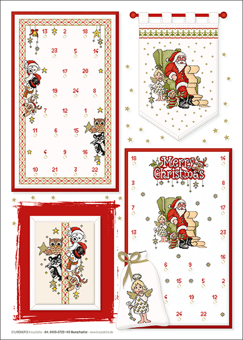 Wir haben für den richtigen Rahmen gesorgt und diesen Bogen entwickelt, der Ihnen ermöglicht einen lustigen Adventskalender zu Sticken, oder die Motive auf andere dekorative Schmuckstücke im gezählten Kreuzstich festzuhalten.